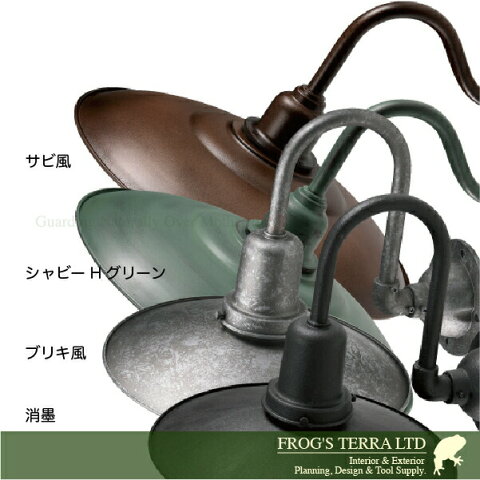 エクステリア照明(ガーデンライト) 【外寸】傘径23cm/ブラケットD41cm/フランジ径9cm 【素材】スチール 塗装仕上げ(傘)配線付 【色】サビ風、シャビーHグリーン、ブリキ風、消墨からお選び下さい 【付属】LED電球 7.8W(普通電球60W相当)(電球色) ※受注生産のため、納期は7営業日かかります。